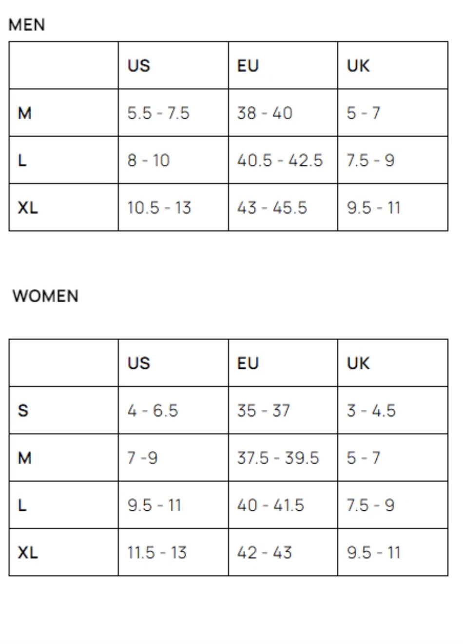 US Sizes MEN: Medium 5.5 – 7.5, Large 8 – 10, XL 10.5 – 13.